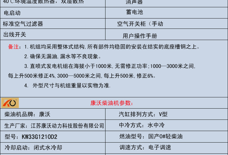 3.直噴式發(fā)電機(jī)組在海拔小于1000米,無(wú)需修正功率;1000—3000米之間,每上升500米修正4%,3000—5000米之間,每上升500米,修正6%。