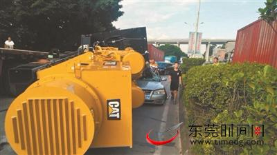 ▲重達(dá)17噸的發(fā)電機(jī)從拖掛車跌落,砸中小轎車 交警供圖