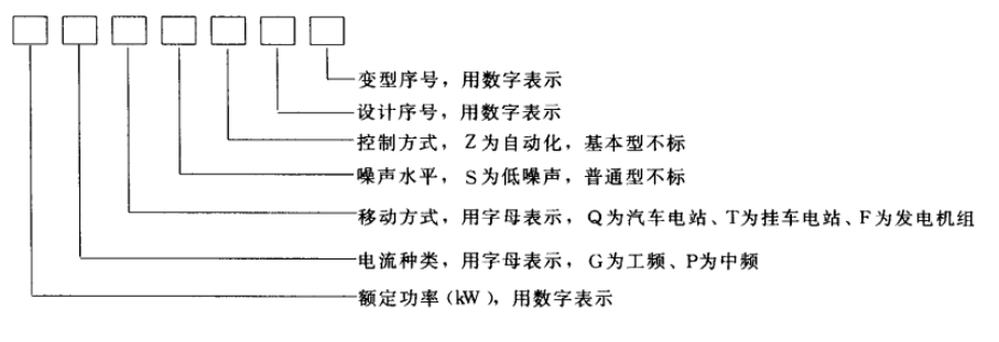 變型序號,用數字表示 設計序號,用數字表示 控制方式,Z為自動化?;拘筒粯?噪聲水平,S為低噪聲。普通型不標。移動方式。用宇母表示,Q為汽車電站、T為掛車電站、F為發電機組。電流種類,用字母表示,G為工頻、P為中頻 。額定功率(kW ),用數宇表示例如。 20GF7-8柴油發電機組,表示額定功率為20kW的工頻(50Hz)柴油發電機組 的第七種形式,第八次變型; 50GFSZ1-2柴油發電機組,表示額定功率為50kW工頻低噪 聲自動化柴油發電機組,第一種形式,第二次變型。單相和H相發電機組型號制編方法一 樣,只是技術規格方面有所區別。