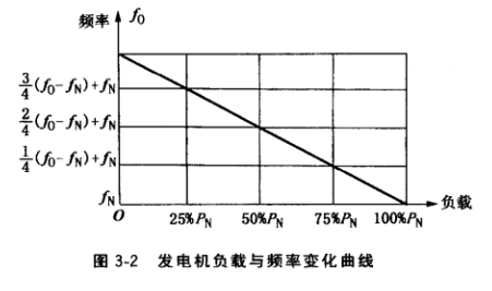 (2) 發(fā)電機滿負荷運行時,內(nèi)燃機轉(zhuǎn)速一定要達銘牌規(guī)定的額定值,不同負載時其對應的轉(zhuǎn)速從圖3-2査找,圖中PN為額定功率;?N為額定頻率,其值按銘牌規(guī)定;?o為空載頻率,其值按發(fā)動機穩(wěn)態(tài)調(diào)速率規(guī)定,—般為(1 + 5%)?N。圖3-2應用示 例:發(fā)電機負載為25%PN時,在圖中橫坐標25%PN處引垂線交粗實線,再從該交點引縱坐標垂線,則交點數(shù)值即為與25%PN對應的頻率值3/4?o-?N)+?N,以?N = 50Hz、?o=52.5Hz為例,求得此時應調(diào)節(jié)發(fā)動機轉(zhuǎn)速使發(fā)電機頻率= 3/4(52. 5-50) + 50 = 51. 875Hz。