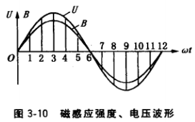 (2) 交流電的產生。交流電指的是大小和方向隨時間按正弦規律作周期性變化的電流或電壓。圖3-9所示發電機轉子順時針方向旋轉,當磁極①、②這一對N、S極掠過定子繞組U1的導線時,該繞組導線感應的電壓為:磁極①極性為N,當極弧表面上的點1、2、3三 個位置先后掠過繞組U1時,該繞組感應電壓方向用右手定則判定為正;磁極②極性為S, 當極弧表面上的點4、5、6三個位置先后掠過繞組U1時,該繞組感應電壓方向用右手定則判定為負。由于磁極鐵心極弧表面與定子鐵心之間的氣隙大小設計成不均勻,中央氣隙小, 兩側氣隙大,通過氣隙大小和極靴寬度的合理選取,使沿極弧表面各處的磁感應強度按正弦曲線分布。當磁極的不同點掠過繞組U1時,該繞組感應的電壓大小也按正弦曲線分布,如圖3-10所示,這就是單相交流電。交流發電機的轉速、磁極對數和感應的 交流電頻率之間的關系式為:?=Pn/60 (式中?為交流電頻率,n為轉速,P為極對數)。在圖3-9中一個N極和一個S極組成1個極對數,該發電機為4極,即2 對極。