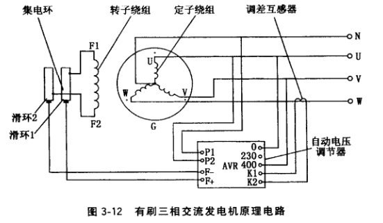 (4) 整機工作原理。有刷三相交流發電機原理電路如圖3-12所示。由勵磁電源輸出的直流電(勵磁電源可來自直流勵磁機發出的直流電壓、交流勵磁機發出的交流電經整流成的直流電壓、定子副繞組感應的電壓經整流成的苜流電壓、定子主繞組抽頭電壓經整流成的直流電壓),經滑環、集電環向轉子磁極繞組F1F2提供勵磁電流。發電機由內燃機驅動至接近額定轉速,依靠轉子磁極鐵心的剩磁磁場(新機或經大修的舊機須經充磁后,磁極鐵心才有剩磁磁場〉,在定子繞組中感應出交流電。由于定子槽中嵌人的繞組按三相布置,因而感應出三相交流電壓。調節磁場變阻器或自動電壓調節器(AVR)的電位器,可使發電機空載電壓整定在額定電壓值。負載時,依靠自動電壓調節器對轉子勵磁電流進行自動調節,以維持發電機電壓恒定。未配備自動電壓調節器的,則依靠手動調節磁場變阻器對轉子勵磁電流進行調節,以維持發電機電壓接近額定值。