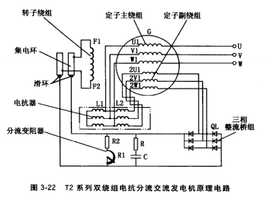 此種發(fā)電機(jī)也是一種相復(fù)勵(lì)交流發(fā)電機(jī),它的結(jié)構(gòu)與電抗變流復(fù)合式相復(fù)勵(lì)發(fā)電機(jī)基本相似,不同之處在于電抗器的結(jié)構(gòu)和作用,后者電抗器鐵心有氣隙,有初級(jí)繞組L1、次級(jí)繞組L2,起電抗、變流作用;而前者只有一個(gè)繞組,由抽頭將它分成兩部分,分別起電抗、 分流作用。