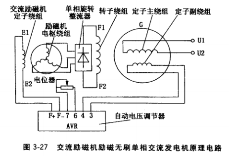 流發電機基本相同,不同之處在于定子鐵心槽中的定子主繞組是單相而不是三相,且定子主繞組、副繞組結構與有刷單相交流發電機相同,此時定子副繞組的作用是向交流勵磁機定子 磁極繞組提供勵磁電流。