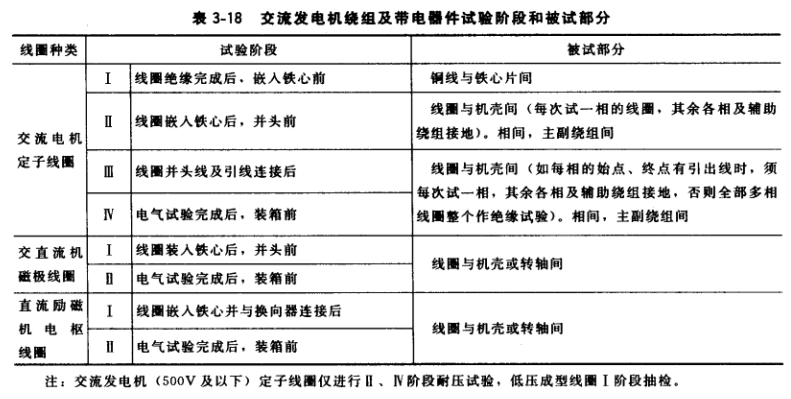發電機繞組及各帶電器件耐電壓試驗階段和被試部分見表3-18。