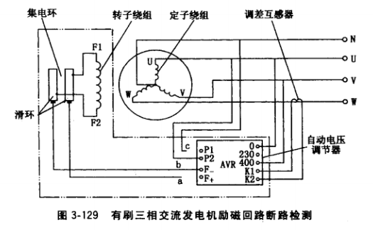 圖3-129中雙點劃線框內部分為這種發電機勵磁回路,它包括U相定子繞組、AVR (或整流橋組)、集電環、轉子繞組F1F2及各段連接線。