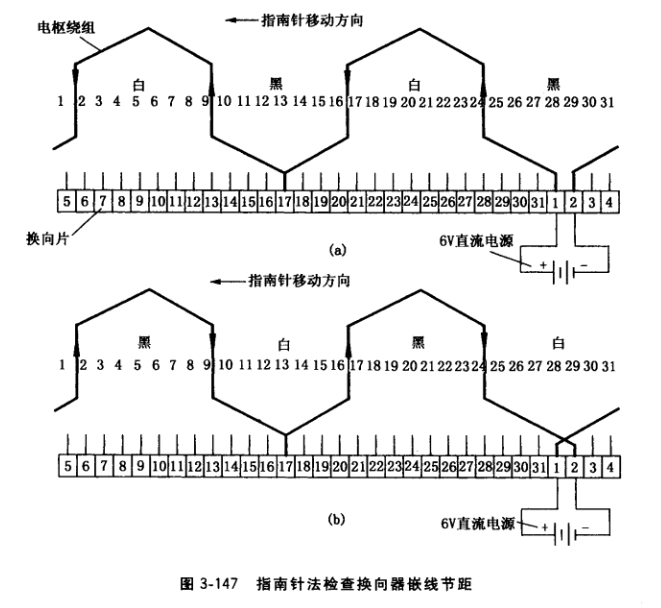 ②用指南針沿通電的繞組依次移動,觀察 指南針指向是否異常,可以判斷嵌線錯誤。圖 3-147以換向片1、2所連接的電樞繞組為例,檢測時把電樞垂直放S臺面。圖a為IH確嵌線,在換向片1、2施加6V直流電壓,正極接片1,負極接片2,此時繞組電流方向如箭頭 所示,把指南針靠近電樞表面順時針移動一周,磁針指向先后順序為黑、白、黑、白。依此 方法,逐個測試換向片2、3, 3、4……磁針指向均應黑、白、黑、白。圖b中與換向片1、 2連接的電樞繞組引線嵌錯,這時電樞繞組中電流方向與圖a相反,則指南針順時針移動一 周時,磁針指向與圖a相反。說明檢測過程中,磁針指向規律突然變反,可斷定該處繞組在 換向片上嵌反。