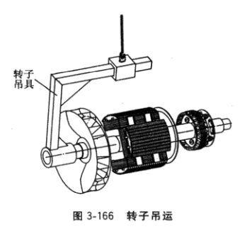 (4)退出轉子。用圖3-165所示吊具,套入轉子軸伸端,輕輕吊起轉子,沿箭頭方向緩緩退出轉子。不須拆彈性聯軸器或盤式柔性聯接片的發電機轉子退出法:由人工邊轉動轉子邊軸向退出轉子,當轉子鐵心段剛露出定子機座時,用粗麻繩圈套鐵心外徑,輕輕吊起轉 子,緩緩退出轉子。不管采用以上哪種方法,退出轉子過程切不可碰傷定子繞組。退出轉子后如圖3-166所示,仍由吊具吊運轉子然后輕放在干凈、可靠的臺架上。
