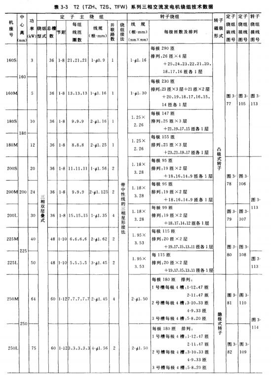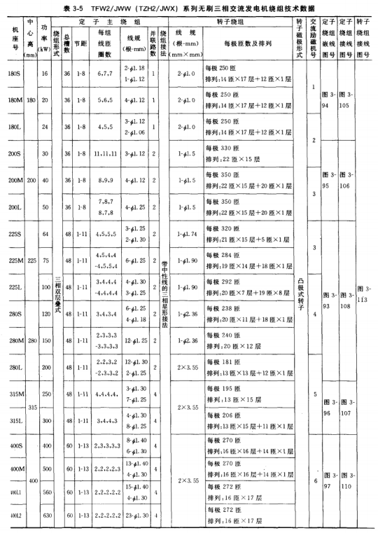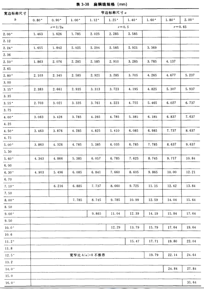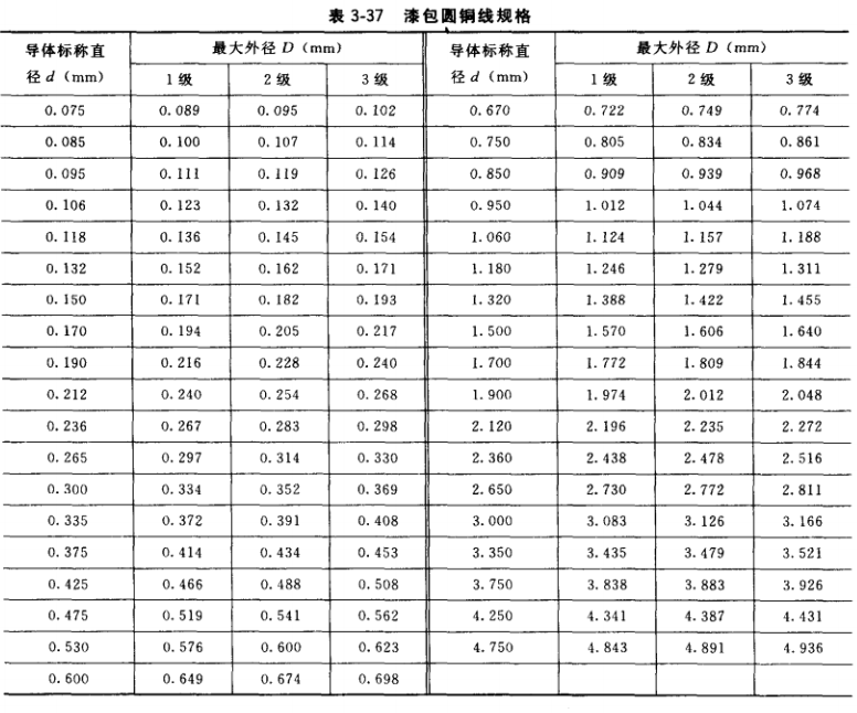 (2)繞組線規(guī)。中小型三相交流發(fā)電機(jī)定子繞組一般采用漆包圓銅線。修理時(shí)根據(jù)交流發(fā)電機(jī)的型號、規(guī)格,從相應(yīng)的表3-3?3-6中査找或采用實(shí)測法確定線規(guī)(若二者線規(guī)有出入時(shí)以實(shí)測線規(guī)為準(zhǔn),下同)。線規(guī)實(shí)測方法:從故障交流發(fā)電機(jī)定子槽中拆出一個(gè)線圈, 找到該線圈第一匝,用千分尺或游標(biāo)尺測量線徑(必須測量裸銅線直徑,而不是測量漆包線或絲包線外徑),若該線圈由多根線并繞,還必須測最其中不同線規(guī)線的直徑及根數(shù)。然后 根據(jù)修理該用的漆包線規(guī)格迸行采購。由于漆包線國家標(biāo)準(zhǔn)已更新,當(dāng)開列的漆包線規(guī)格在市場買不到時(shí),應(yīng)就近選用國家新標(biāo)準(zhǔn)規(guī)定的線規(guī),但線規(guī)截面積或多根并繞的總截面應(yīng)足 夠。現(xiàn)行國家標(biāo)準(zhǔn)規(guī)定的漆包圓銅線標(biāo)稱直徑見表3-37,扁銅線標(biāo)稱規(guī)格見表3-38。
