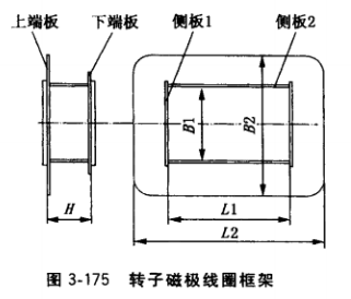 分體凸極式轉子繞組線圈框架制作:線圈框架一般均由玻璃纖維增強聚碳酸酯壓塑料壓制而成,但修理現場難以獲得壓塑料框架,一般可自制組合式線圈框架,其結構見圖3-175。線圈框架由上端板、下端板、側板 1和側板2組合而成,各板均采用2?3mm厚環氧玻璃布板沖制或手工制作,框架各個尺寸按以下確定: