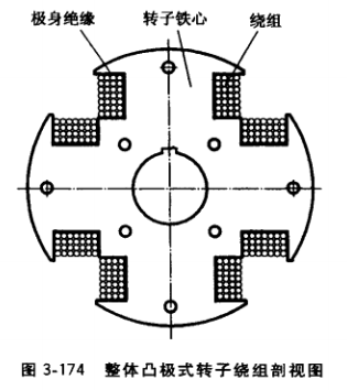 單、三相交流發電機凸極轉子繞組有兩種結構形式:分體凸極式鐵心磁極繞組,其剖視如圖3-173所示,包括線圈框架和漆包線繞組;整體凸極式鐵心磁極繞組,其剖視如圖 3-174所示,包括磁極鐵心極身絕緣和漆包線繞組。