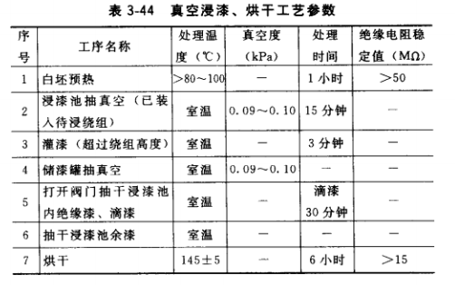 (3)設備及工具。真空浸漆、烘干成套設備;烘房;吊運工具:吊車、平車、鐵筐;儀 器:涂-4粘度計,秒表,溫度計(0?200℃), 500V兆歐表。