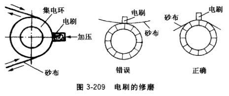 (2)電刷修磨。發(fā)電機(jī)工作150小時(shí)左右,就應(yīng)檢査電刷與集電環(huán)(換向器)的接觸情況,其接觸面積不得小于電刷橫截面的75%。如接觸面積過(guò)小,可修磨電刷接觸面。修磨時(shí), 先將電刷彈簧壓力調(diào)小,將00號(hào)砂布置于電刷與集電環(huán)之間,并使砂面朝電刷,然后將電刷彈簧壓力調(diào)大,來(lái)回拉動(dòng)砂布,如圖3-209所示,直至電刷的接觸面積符合要求為止。