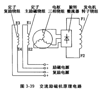 當發電機轉速恒定且空載時,直流勵磁機按圖 3-39接線,自勵發電,向發電機轉子磁極繞組提供勵磁電流,使發電機發電。沿圓周方向逐步移動勵磁機電刷架,出現發電機輸出電壓為最大值時,電刷的工作位罝便處于中性線。