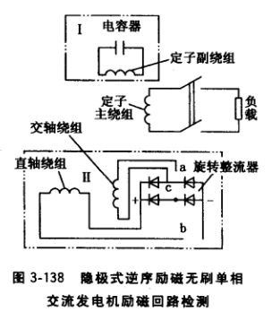 ③勵磁回路斷路或電氣接觸不良。圖3-138雙點畫線框I和雙點畫線框Ⅱ兩部分為隱極 式逆序勵磁無刷單相交流發電機勵磁回路,框I包括定子副繞組、電容器及連接線;框Ⅱ包 括交軸繞組、旋轉整流器、直軸繞組及連接線。勵磁回路任何一處斷線或電氣接觸嚴重不良,都導致勵磁電流無通路,發電機不能發電。