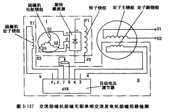 ④勵磁回路斷線或電氣接觸不良。圖3-137雙點畫線框Ι和雙點畫線框Ⅱ內的電路是交流勵磁機勵磁的無刷單相交流發電機勵磁回路。框I部分包含勵磁機電樞繞組、旋轉整流 器、轉子繞組及各段連接線。框Ⅱ部分包含定了副繞組(或定子主繞組線端)、AVR、勵磁 機定子繞組E1E2。勵磁回路任何一處斷線或電氣接觸嚴重不良,都導致勵磁電流無通路, 發電機不能發電。