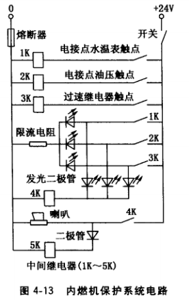 (1) 內(nèi)燃機(jī)保護(hù)系統(tǒng)。有高水溫、低油壓和超速保 護(hù),典型電路如圖4-13所示(有的內(nèi)燃機(jī)還有欠速、冷 卻水中斷、油溫高、燃油油面低、并列機(jī)組逆功率保護(hù) 等)。機(jī)組運(yùn)行中,一旦內(nèi)燃機(jī)出現(xiàn)高水溫、低油壓和超 速時,電接點(diǎn)水溫表觸點(diǎn)、電接點(diǎn)油壓表觸點(diǎn)和過速繼 電器觸點(diǎn)閉合,繼電器1K、2K、3K得電動作,使其常開觸點(diǎn)閉合,一方面使發(fā)光二極管發(fā)出光報(bào)警信號,另 —方面使繼電器4K動作,喇叭發(fā)出聲報(bào)警信號,同時繼電器5K動作,機(jī)組立即自動停機(jī),起到了保護(hù)作用。 有的內(nèi)燃機(jī)設(shè)水溫表和油壓表,用于監(jiān)控其工作時的水溫和油壓。