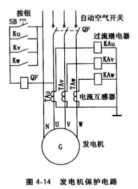 (2) 發(fā)電機(jī)保護(hù)系統(tǒng)。小型發(fā)電機(jī)由于容量小,所 以保護(hù)裝置比較簡單,一般用自動空氣開關(guān)中瞬時脫扣器和熱脫扣器來實(shí)現(xiàn)短路和過載保護(hù)(有的發(fā)電機(jī)還有過電壓、欠比、接地等保護(hù))。用戶訂貨時可對自動空氣開關(guān)的瞬時脫扣和熱脫扣的整定值提出具體要求,否則出廠時一般均按最大值整定,很難達(dá)到整定要求,起不到保護(hù)作用。因此有的廠家為了保護(hù) 可靠,另外加設(shè)了短路和過載保護(hù),如采用熔斷器作短路保護(hù),用過流繼電器作過流保護(hù)(見圖4-14)。有的廠家為了節(jié)省一個電流互感器,取消了 TAV,將Kv直接與中性點(diǎn)連接。
