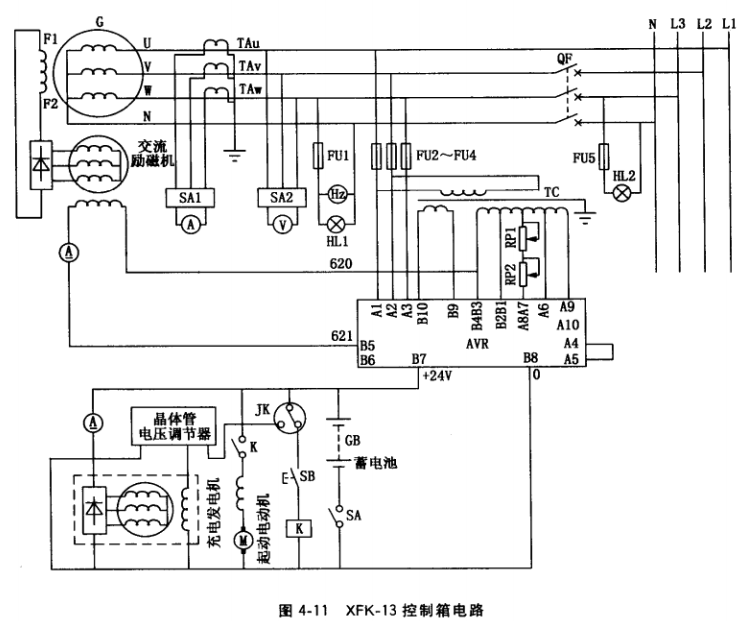 各廠家發(fā)電機(jī)組控制箱電路圖一般大同小異,不同之處主要在于勵磁系統(tǒng)及裝設(shè)的電工儀表的多少。圖4-10、圖4-11分別為PF16-50、XFK-13控制箱電路,其主要元器件分別見 表4-3和表4-4。
