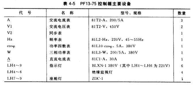 (3)并列運(yùn)行的小型三相發(fā)電機(jī)控制箱電路。圖4-12為PF13-75發(fā)電機(jī)控制箱電路, 主要增加了并列運(yùn)行部分和監(jiān)視儀表,其主要元器件型號、規(guī)格見表4-5。