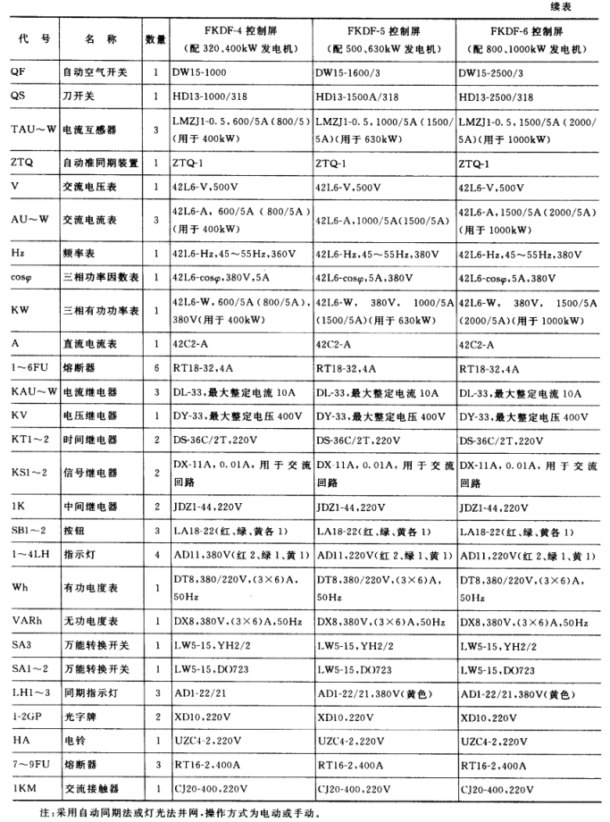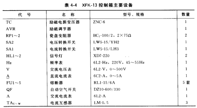 FKDF控制屏為封閉式結(jié)構(gòu),四面用鋼板彎制而成,骨架采用成 型角鋼(或鋼板彎制),屏面上部為 開啟式門,門上裝有功率表、電流表(三相)、功率因數(shù)表、直流電流 表、頻率表、電壓表、信號燈、按 鈕、并聯(lián)裝置和控制開關(guān)等,門內(nèi)裝有電壓繼電器、電流繼電器、時 間繼電器、信號繼電器、屮間繼電 器.有功、無功電度表和電鈴等,屏的中部裝刀開關(guān)和轉(zhuǎn)換開關(guān)、自 動準(zhǔn)同期裝置,下部裝電流互感器 等。其外形見圖4-1,原理電路圖 見圖4-2,主要設(shè)備見表4-1。