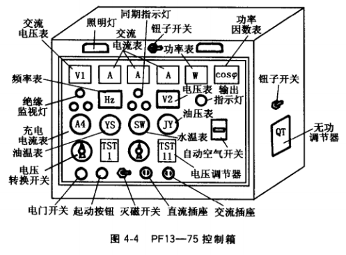 發(fā)電機(jī)組控制箱主要用于移動 式或容量較小的發(fā)電機(jī)的控制、測 量、保護(hù)和送配電,一般為封閉式 金屬結(jié)構(gòu),用優(yōu)質(zhì)鋼板沖壓、焊接而成。它經(jīng)減震器安裝在發(fā)電機(jī)背上,與發(fā)電機(jī)組成一體。圖4-3為 KXDF發(fā)電機(jī)控制箱,面板上裝有 電流表、電壓表、頻率表、功率表、按鈕、指不燈和自動空氣斷路器(空氣開關(guān))的操作機(jī)構(gòu),可方便地監(jiān)測發(fā)電機(jī)運(yùn)行情況并進(jìn)行操作。控制箱側(cè)面還裝有磁場變阻器,供調(diào)節(jié)發(fā)電機(jī)電壓或無功。控制箱面板上設(shè)置儀表的多少隨發(fā)電機(jī)的容量不同和用戶要求不同而不同。有的沒有功率表,有的只裝電流表和電壓表、頻率表,最簡單的只裝一只電壓表。發(fā)電機(jī)的勵磁方式不同, 用于調(diào)節(jié)發(fā)電機(jī)電壓的設(shè)備也不同,除上述 用的磁場變阻器外,有的用電抗器,電壓調(diào) 整率高的則用自動勵磁調(diào)節(jié)器(AVR)。