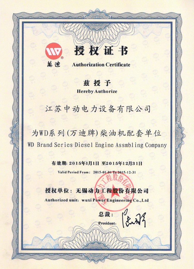 江蘇動力工程股份有限公司授權(quán)江蘇中動電力設(shè)備有限公司作為柴油機配套商