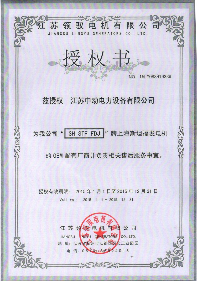 江蘇領馭電機有限公司授權江蘇中動電力設備有限公司作為發(fā)電機配套商